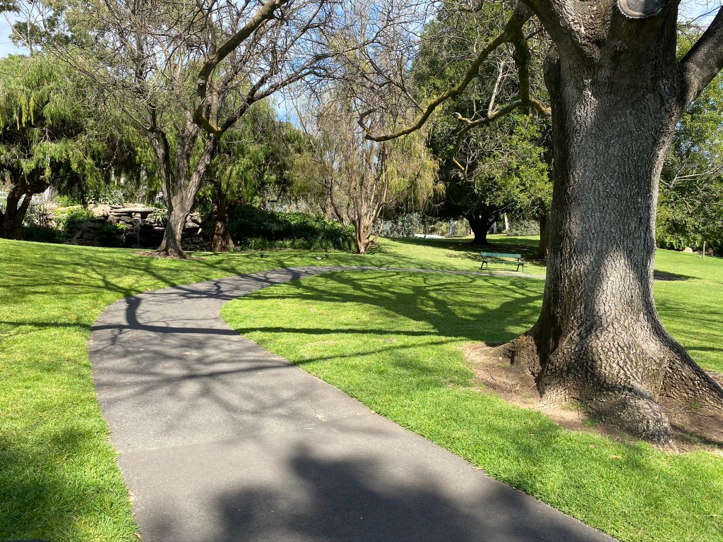 These days, because of my spine, I can’t walk for long and, relying on my walker, frequently have to rest to ease the pain. This is no chore as I can sit on my walker or one of the park benches and just enjoy the place for a while. Throughout the gardens there are plaques of dedication to others over the years who have spent many hours in the parkland, as I now do.